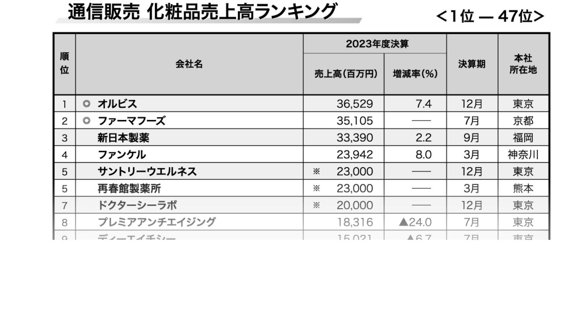 2位のファーマフーズの23年7月期の、育毛剤などを含む化粧品通販の売上高は、351億500万円だった。同社の「ニューモ」ブランドのまつ毛美容液「WMOA(ウモア)」の販売が好調で、23年7月末時点の累計出荷件数が220万本を突破したとしている。