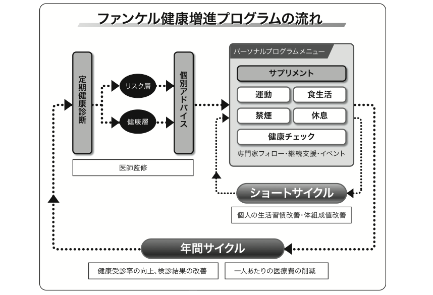 4月から開始したのは「ファンケル健康管理プログラム」。ほとんどの企業は年1回、従業員に健康診断を受診させている。健康診断の結果を活用して医師監修の下、カウンセリングやサプリメントの提供、食生活や運動指標をパーソナルなメニューとして提供するのが特徴。