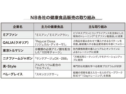 サプリメントや化粧品の販売が主力のネットワークビジネス(NB)では、コンプライアンスに基づいた提案スキルをより高めるため、トレーニングに力を入れる企業が増えている。ニナファームジャポン(本社東京都)は、大阪・関西万博のゴールドパートナーである仏・ニナファームの出展を記念したトレーニングを実施。ペレ・グレイス(本社東京都)は、タイトル維持を重点にした戦略を加えたほか、グループワーク主体の新しいトレーニングを始めたり、地方に特化した研修旅行やイベントを行ったりしている。独自性のある成分を使った自社製品と研修の強化で事業をスタートした新興企業も目立つ。