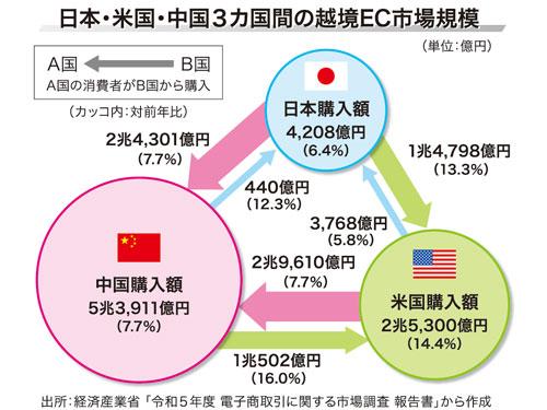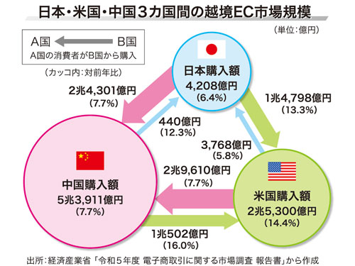 経産省が発表した「令和5年度 電子商取引に関する市場調査」の「各国間の越境EC市場規模の推計結果(23年)」によると、日・米・中の3カ国間の越境ECの市場規模を比較した際、最も市場規模が大きかったのは中国だった。中国の総市場規模(他の2国から越境ECで購入している総額)は、前年比7.7%増の5兆3911億円。米国は前年比14.4%増の2兆5300億円。日本は、前年比6.4%増とはいえ4208億円にとどまった。