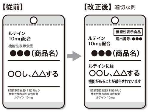 機能性表示食品のパッケージの見直しは、24年9月1日に食品表示基準が改正され、施行された。26年8月末までを猶予期間とし、26年9月1日から、新しいパッケージの表示が完全施行される。