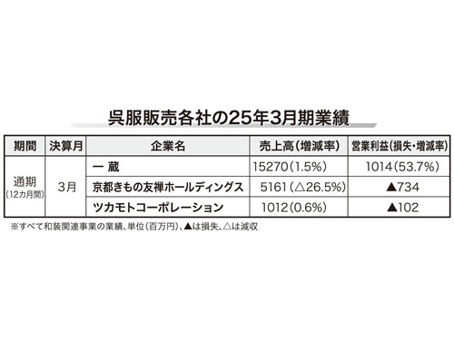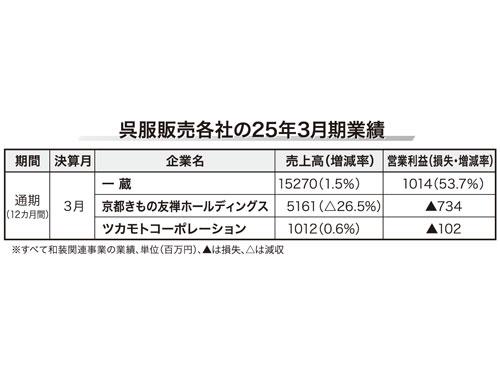 呉服販売企業の25年3月期決算をまとめた。上場企業など25年3月期決算の3社の決算では、京都きもの友禅ホールディングス(HD)の苦戦が続いている。
