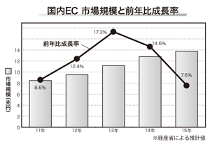 経産省が公表した「平成27年度我が国経済社会の情報化・サービス化に係る基盤整備(電子商取引に関する市場調査)」によると、BtoC―EC市場の対前年比の伸び率は、14年の14.6%増と比べて、15年は7.6%増となり、成長が鈍化していることが分かった=図。成長が鈍化した要因について経産省では、(1)個人消費全体の後退(2)オムニチャネル化(3)フリマ市場の拡大ーーの三つがあると分析している。オムニチャネルについて経産省では、「単なる流行に止まることなく定着化しており、その勢いはさらに加速している」とみている。
