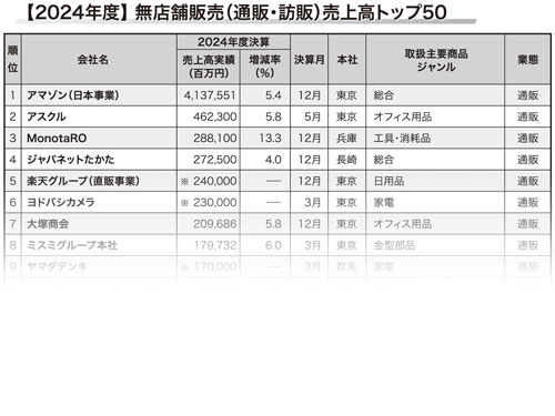 【無店舗販売企業 2024年度売上高調査上位50社合計売上は9.4兆円/前年に比べ7.8%の成長に(2025年8月7日・14日合併号)