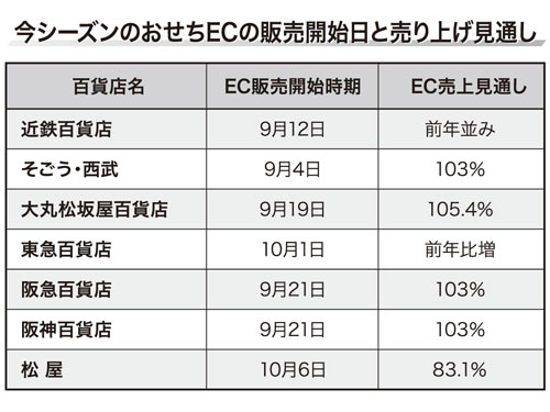 百貨店のおせち商戦が開幕した。おせち市場においては長らく、百貨店がマーケットリーダーを担ってきたが、プレーヤーは増え続けており、市場の競争は激化している。百貨店が今後もおせち市場で成長を続けるためには、新規顧客の開拓が不可欠。独自性の追求が成長の鍵となりそうだ。百貨店のおせちの通販・EC市場のトレンドとしては、前年に続き、EC化率の高まりが予想される。受注の早期化も進んでいる。全体的な消費傾向としては、「節約志向」が高まっている。一方で、百貨店は、「ハレの日」に高単価商品を購入する余裕のある客層も多く抱えている。消費が二極化する中、各社は幅広いニーズに対応できる商品を取りそろえ、おせち商戦を迎えようとしている。各社は、最大9連休となる年末年始を楽しんでもらえるような、バラエティー豊かなおせちを展開しているようだ。(関連記事を2面に掲載)