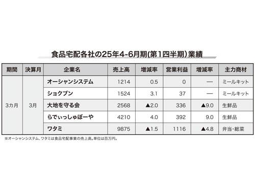 食品宅配企業の25年4―6月期(第1四半期)決算をまとめた。上場企業など決算を公表している5社の決算の業績は、らでぃっしゅぼーや、オーシャンシステム、ショクブンが増収で、大地を守る会とワタミの2社は減収だった。
