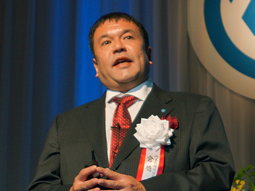 冒頭、倉橋社長があいさつ。「100周年を迎えられたのは、ひとえにお取引先さま、そしてわれわれの医療機器、治療機器をお使いいただいているご愛用者の方々に支えられてきたおかげだと思っている」と謝辞を述べた。「創業者である伊藤賢治の言葉に『分析して検査をするだけでは患者様が治らない。われわれは治療器を作るべきだ』というものがある。その言葉を受け、われわれは物理療法の治療機メーカーとしてやってきた。物理療法の治療効果というところに特化して、社会に貢献していきたい。次の百年に向かうこの新たな日に、伊藤超短波の経営ビジョンを、『物理療法を極める』という風に定めたいと思う」とスピーチした。
