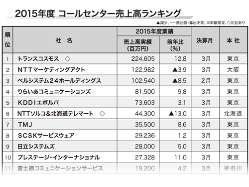 14年度は減収だった4位のりらいあコミュニケーションズと、5位のKDDIエボルバは、いずれも前期は増収に転じている。りらいあコミュニケーションズは、大型のスポット業務の終了に伴い、一時的に売り上げを落としたものの、既存クライアントの業務拡大に取り組んだことでプラスに転じたとしている。KDDIエボルバは、通信キャリア系と官公庁の案件が順調に増加した。