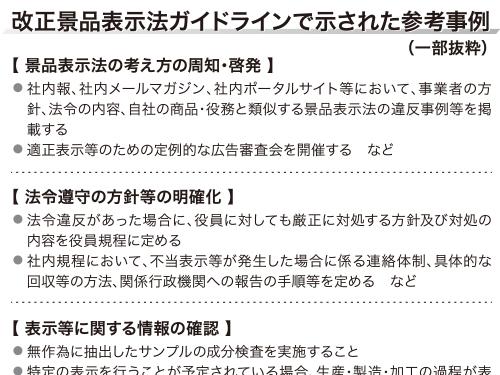 14日に公表されたのは「事業者が講ずべき景品類の提供及び表示の管理上の措置についての指針」。ガイドライン案は14年8月に公表されており、その後、パブリックコメントの結果を基に修正が加えられた。ガイドラインでは、事業者が行うべき措置として、(1)景品表示法の考え方の周知・啓発(2)法令順守の方針等の明確化(3)表示等に関する情報の確認(4)表示等に関する情報の共有(5)表示等を管理するための担当者等を定めること(6)表示等の根拠となる情報を事後的に確認するために必要な措置を取ること(7)不当な表示等が明らかになった場合における迅速かつ適切な対応109640の7点を列挙している。