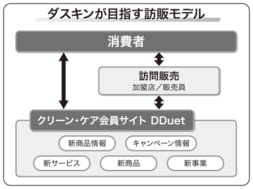 ダスキンは、タブレット端末や会員サイト「ディーデュエット」を活用した営業活動を加速させている。訪問販売で会うことができない消費者との接点作りとして、14年1月から会員制サイト「ディーデュエット」を本格稼働。会員数は順調に増え続け、16年9月末現在で29万人が登録した。異業種との共同プレゼントキャンペーン企画や、休眠顧客に対する名前入りのDM「ディーデュエットレター」をポスティングする取り組みも会員増に寄与している。17年1月からは、タブレットを使った接客スキルを引き上げるために販売員向けの社内資格制度も開始。17年3月末にはタブレットを活用する販売員を3000人に引き上げる計画だ。