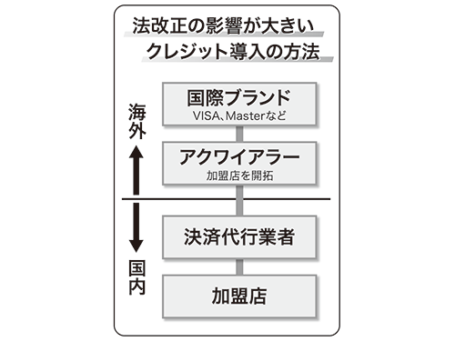 割賦販売法の改正により、訪問販売・ネットワークビジネス(NB)企業や中小EC企業が、クレジットカードの加盟店契約を結んでいるクレジット決済代行業者から契約を解除される可能性が浮上している。特に大きな影響を受けると考えられるのが、審査基準の低い海外アクワイアラー(※)と加盟店契約を結んでいる事業者。法改正に基づくアクワイアラーへの登録制度の導入と、「悪質な加盟店」の排除の義務付けが、無店舗販売業界にも少なからぬ影響を及ぼす可能性がある。