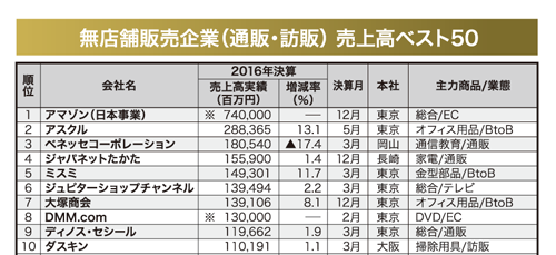 本紙はこのほど、無店舗販売企業の売上高(15年10月―16年9月の間に迎えた決算期が対象)を調査し、上位50社をランキングにした。