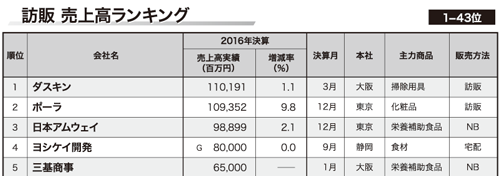 日本流通産業新聞はこのほど、訪問販売を実施している企業を対象に売上高を調査した。ランキング化した234社の合計売上高は1兆6584億7600万円。前年調査と比較可能な232社の実質成長率は前年比1.5%減だった。16年8月に実施した前回調査ではプラス成長となったが、再びマイナス成長になった。
