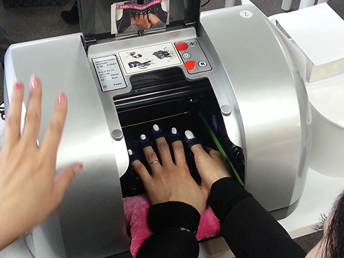 顧客が選んだ柄を専用のタッチパネル端末で爪の大きさにフィットさせる。爪の大きさにかかわらず印刷できる仕組みとなっている。