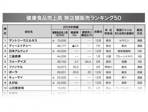本紙はこのほど「第13回無店舗販売実施企業健康食品売上高調査」を実施、集計をランキングとしてまとめた。サントリーウエルネスは9年連続で1位となった。上位50社の合計売上高は7400億8800万円で、前回調査(16年3月実施)の上位50社合計を199億9000万円上回った。