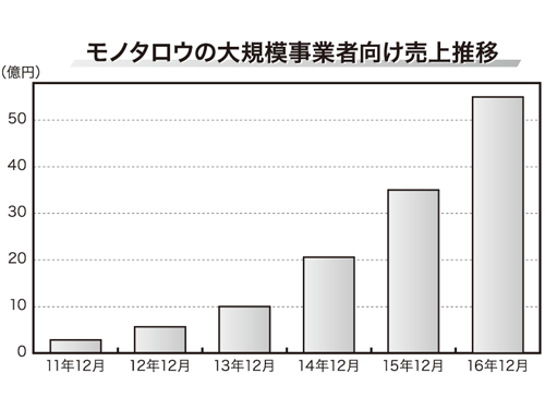 モノタロウでは顧客の7割以上が従業員数50人以下の事業者だ。01年の創業以来、中小規模の事業者向けにサービスを展開してきたが、11年から大規模事業者のユーザー数を急速に増やしている。16年12月期の総売り上げは前期比21.0%増の696億4700万円。7期連続で前年比20%以上の増収を達成している中、大規模事業者向けの売り上げはさらに伸び率が高い。同期の大規模事業者の利用による売り上げは約57%増の55億円。11年12月期の売り上げの約19倍に成長している。