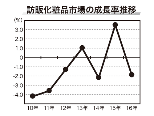 本紙が算出した、訪販化粧品市場の実質成長率の推移をみると、訪販化粧品市場は2010年以来、プラス成長とマイナス成長を繰り返している。