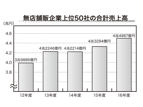 日本流通産業新聞はこのほど、無店舗販売企業の2016年度(16年4月~17年3月の間に迎えた決算期)の売上高調査を実施した。上位50社の合計売上高は4兆4987億100万円で、前年同期間調査と比べ3.9%の増加となった。金額ベースでは、1702億6000万円の増加だった。実質成長率は通販が5.1%増、訪販が0.8%増で通販・訪販とも2期連続で増収となった。