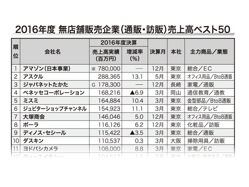 【16年度 無店舗販売企業 売上高ベスト50】〈実質成長率〉通販5.1%、訪販0.8%/通販・訪販とも2期連続増収に