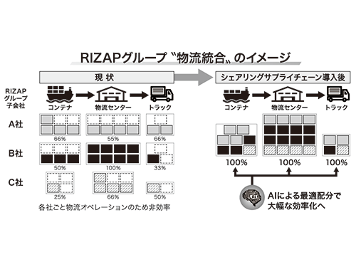 RIZAPグループは11月1日、グループ全体の国内外における物流機能を統合し、コスト削減や業務の効率化を図る。人工知能(AI)を活用し、物流センターやコンテナ、トラックなどの積載効率を最適化する。21年3月期までにグループ全体の物流コストを25%以上削減することを目指している。