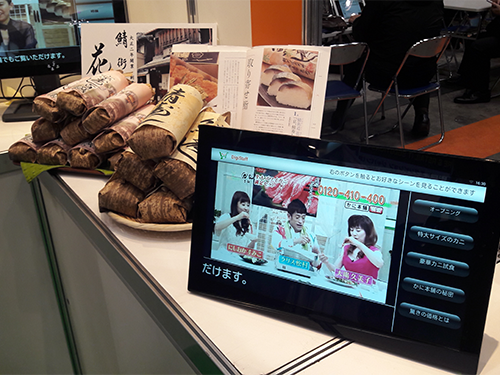 モニターシステム「電子店員(デジスタッフ)」は店員の役割を果たす。「人気の理由」「ご愛用者の声」「技術の歴史」といった質問項目をモニターに表示。来店者が気になる項目をタップすると、収録した映像の中から質問に対応する部分を流す。