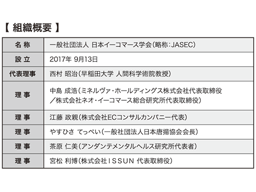 一般社団法人日本イーコマース学会(本部東京都、西村昭治代表理事)がこのほど設立された。アウトドア用品ECのミネルヴァ・ホールディングスの中島成浩社長や早稲田大学の西村昭治教授らが中心となり立ち上げた。通販事業に人工知能(AI)や仮想現実(VR)などの最新技術をいかに応用するかを研究し、成果を参加する通販事業者と共有する。全国に支部を作り、広く参加企業を募る予定だ。