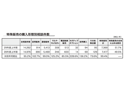東京都は12月6日、17年度上半期(4~9月)に東京都消費生活総合センターに寄せられた相談件数を公表した。相談件数は、前年同期比4・8%減の1万4262件。「通信販売」は同1・0%減だった一方で、「訪問販売」は同2・7%増。「マルチ・マルチまがい」は同25・2%増となっている。