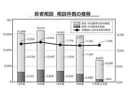 消費生活相談では近年、高齢者の消費者トラブルに加え、契約に対する知識や経験が乏しい若者を巡る相談も目立っている。ネットやSNSなどを使い、サービスを利用する過程で思わぬトラブルに遭うケースが多い。ネットで簡単に契約でき、クレジット払いなど支払能力を超える契約が安易にできてしまうため、若者にはその契約を冷静に判断できないことが大きな原因となっている。
