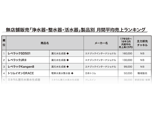 日本流通産業新聞社はこのほど、「第13回〈2018年度版〉浄水器・整水器・活水器 無店舗販売市場調査」を実施し、製品別の月間平均売り上げランキングをまとめた。水素水関連製品のメーカーでは、国内における販売台数が減少傾向にあるものの、海外販売は全般的に順調に推移している。ランキングの1〜3位にエナジックインターナショナル(本社沖縄県)が販売する製品が並んだ。1位の「レベラックSD501」は、海外売り上げを含めた月間平均売上高が16億円となった。エナジックの上位3製品の月間平均売上高の合計は約39億円だった。