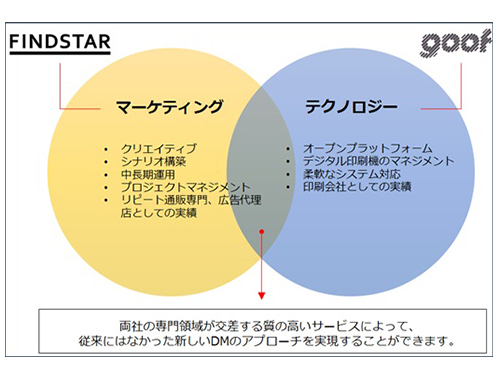 同梱広告やDM施策などに豊富な実績を持つファインドスターと、デジタル印刷機器の運営ノウハウを持つグーフが協力することで、デジタルとアナログが融合したソリューションを開発できたという。