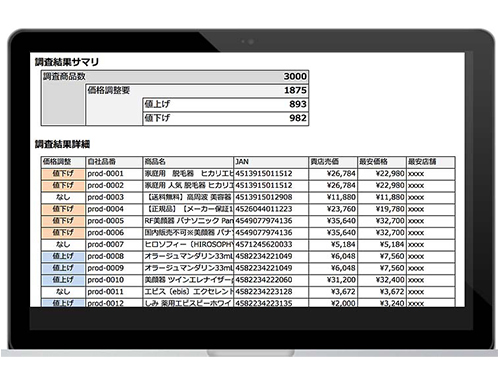 新サービス「価格棚卸しサービス」は、対象のECサイトの取扱商品を調査する。1商品ごとに、(1)多店舗も含め最安価格はいくらか(2)最安価格で販売している店舗はどこか(3)値下げすべきか値上げすべきか─などを一覧で提示する。