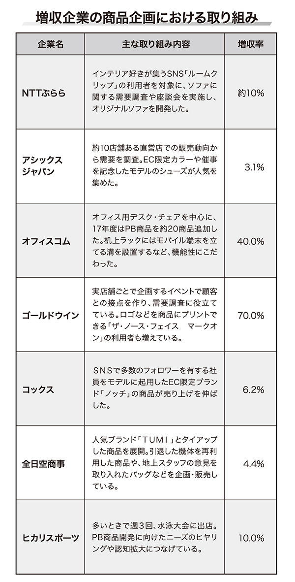 EC事業者の約3割が、増収要因として独自の商品企画を挙げていることが分かった。本紙姉妹紙でEC事業者向けの専門紙「日本ネット経済新聞」がアンケートを実施した結果、EC事業者の48社が増収と回答し、そのうち16社が増収要因を商品企画が奏功したとしている。商品企画を要因とした事業者に追加取材を行った結果、イベントやSNSで顧客と接する機会を設け、顧客の要望や意見を商品企画や改良に生かしているケースが目立つ。ネット通販を展開する場合、価格競争を回避する狙いから、オリジナル商品開発に取り組む事業者は少なくない。追加取材した各事業者の商品開発事例を紹介する。