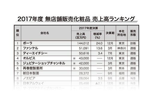17年度の無店舗化粧品販売市場では、訪販化粧品最大手のポーラが、2位のファンケルに900億円以上の差をつけ1位となった。ポーラは前期よりも370億円の増収を達成。ファンケルの売上高も前期比13.6%増となった。ディーエイチシーも前期比3.4%の増収を記録。大手3社が無店舗販売化粧品市場全体の成長を力強くけん引した。