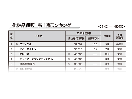 【化粧品訪販 2017年度 売上高ランキング】 62社合計4596億円に/実質成長率はプラス10.1%に