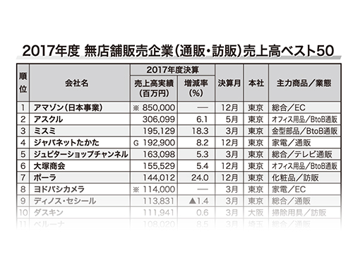 【17年度無店舗販売企業上位50社の売上高】 4.4%増の4.7兆円/実質成長率、〈通販〉5.4%、〈訪販〉3.5%
