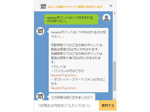 「オムニ7」にトランスコスモスが開発した自動応答エンジン「BEDORE(べドア)」を採用した。高い日本語認識能力を持つ「べドア」を導入することで、ユーザーが入力した問い合わせを正確に理解し、最適な回答を返すことができるという。