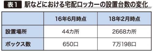国交省によると、駅などの公共スペースに設置された宅配ボックスやロッカーの設置場所は、18年2月の時点で2668カ所。ボックス数で7万198口となっている。16年6月時点と比べると、設置場所は約60倍に増加している(表1参照)。