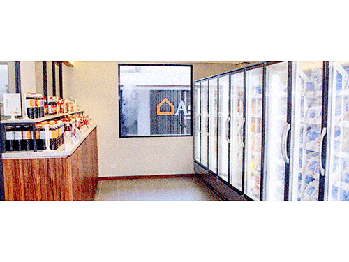 店内は左側にレジカウンターを設置、右側には調味料など常温品(約50品目)の陳列棚と、縦型の冷凍ケースに冷凍品を中心に180品目をそろえている。調理ができるキッチンも設置し、料理教室や無料試食会ができるようにした。