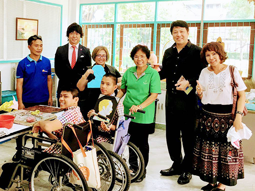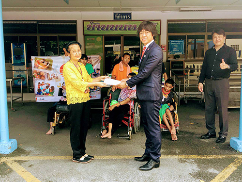 10月10日に菅原会長がタイ・バンコクを訪れ、バンコク郊外の400人が入居する障害者施設におむつ、薬、せっけん、そして現金を寄贈した。