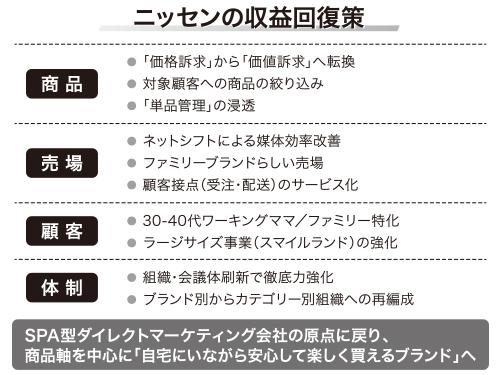 ニッセンホールディングス(ニッセンHD)は今期、通販事業を抜本的に見直す。商品は従来の価格訴求から価値訴求へ転換するほか、インターネットを使った売り場へのシフトも加速する。通販事業の顧客ターゲットは30~40代の主婦層に設定し、総合通販からの脱却を図る。媒体経費削減策の一環として、新規顧客獲得カタログの有料化にも取り組む。通販子会社であるニッセンの業績不振で、14年12月期の純損失は85億1000万円となり2期連続の赤字を計上。業績回復にはニッセンの収益構造見直しが急務と判断した。ただ、今期業績は売上高が前期比2桁減となるほか3期連続の純損失を予想。一連の取り組みによってニッセンの収益が回復するのか、道筋は不透明だ。