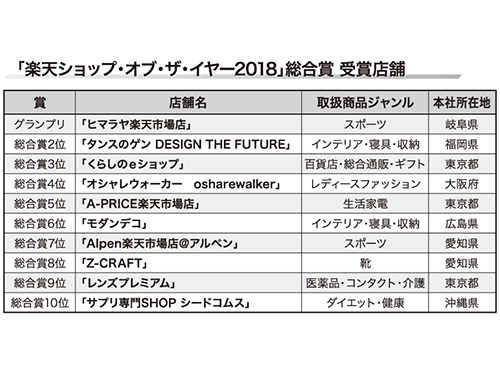 「楽天SOY2018」は、楽天会員による人気投票や売り上げなどを総合的に評価し、選出している。総合賞を10店舗に、ジャンル賞を124店舗(42ジャンル)に、サービス賞を26店舗に、特別賞を8店舗に、それぞれ表彰した。