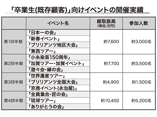 新規顧客の獲得に向けた受講料無料の「きもの着付け教室」は、応募人数が堅調に推移。同教室を修了した生徒が複数回にわたり、ステップアップのための上級教室を受講した。教室継続率が向上したことから、付随する販売会での売り上げも計画通りに推移した。