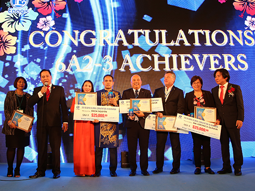 冒頭、参加した販売店の国別の紹介があった後、大城会長が登壇。「真の健康の実現に向け、”水で人生を変えよう!”というエナジックの哲学を、世界にもっともっと広めていきましょう!」と力強く宣言した。6A以上のタイトルにランクアップした販売店の昇格認定式なども行われた。