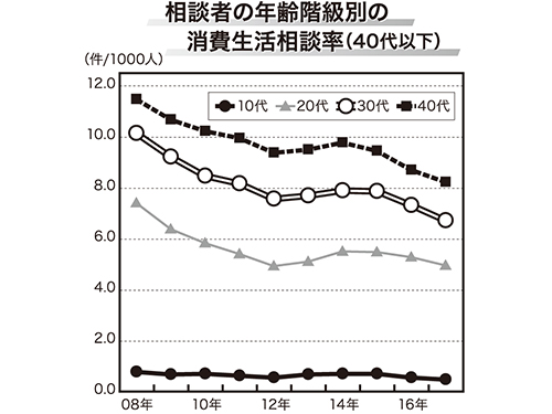 消費者庁が最も懸念しているのが、2022年に予定されている成年年齢の18歳引き下げに伴い、知識や経験の乏しい18~19歳による消費者トラブルが増加するのではないかという点だ。消費者庁の同オフィスが17年~18年にかけて開催してきた「若者の消費者被害の心理的要因からの分析に係る検討会」の報告書には、「15歳~19歳の相談件数に比べ、20歳~24歳の相談件数は約2倍で推移している。15年までは、20歳~24歳の相談件数が25歳~29歳の相談件数よりもやや少ない傾向にあったが、16年を境に逆転している」と明記されている。