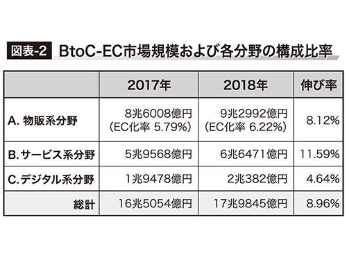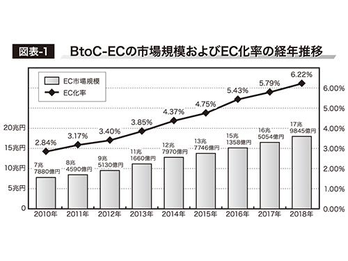 18年のBtoC―ECにおける物販系分野の市場規模は、同8.1%増の9兆2992億円だった。伸び率は0.6ポイント増となり、成長は加速している。ただ、EC事業者の増加やECに対する取り組みの拡大に対して、EC化率は思うように伸びていないという指摘もある。