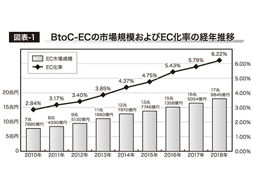 経済産業省は5月16日、18年の消費者向け(BtoC)EC市場規模が前年比8.9%増の17兆9845億円だったと発表した。BtoC―ECの物販系分野におけるEC化率は同0.43ポイント増の6.2%となった。一般社団法人ジャパンEコマースコンサルタント協会(JECCICA、本部東京都)の川連一豊代表理事は、「海外と比較すると成長率は伸び悩んでいる」と指摘する。