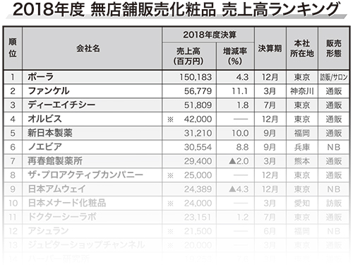 18年度の無店舗販売化粧品市場では上位10社中、訪販化粧品最大手のポーラをはじめ、ファンケル、ディーエイチシー、新日本製薬、ノエビアの5社が増収となり、市場の好景気をけん引した。ファンケルと新日本製薬は2桁成長を記録した。