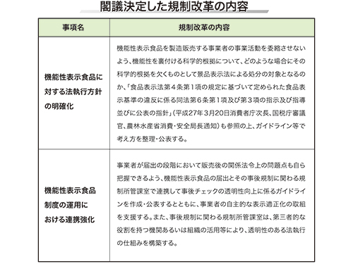 政府は6月21日、規制改革実施計画を閣議決定した。同計画では、(1)機能性表示食品に対する法執行方針の明確化(2)同制度の運用における消費者庁食品表示企画課と同表示対策課の連携強化─の2点を消費者庁に対して求めている。機能性表示食品に対する法執行の基準を明確化したり、広告表示が適法か否かの予見可能性を高めるのが狙いだという。