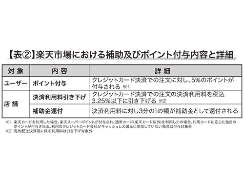 楽天では対象店舗において対応しているクレジットカードで決済したユーザーに購入金額の5%分のポイントを付与する。楽天カードも同事業に参加しており、楽天カードで購入すると楽天スーパーポイントを付与。その他の対応カードで決済した場合は、そのカードのポイントを付与する。