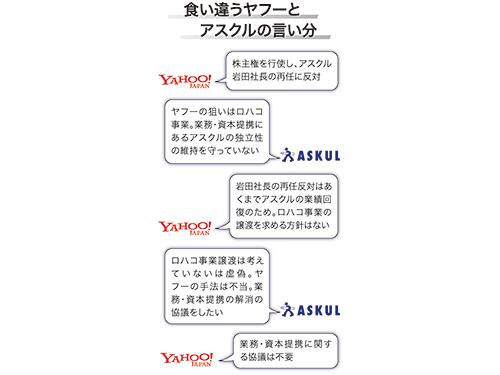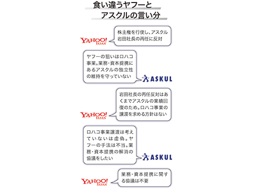 ヤフーは7月17日、岩田社長の再任に反対する旨を公表し、両社の対立が表面化した。アスクルは7月18日、ヤフーの発表に応じる形で記者会見を行い、ヤフーの取り組みについて見解を示した。